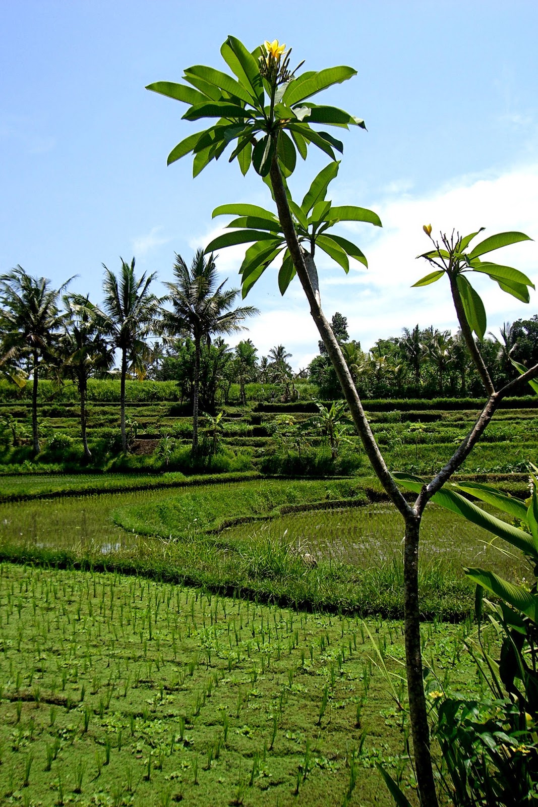 Crossing the footbridge, we wound our way back up the hillside and were treated to some nice views of the sinuously-stepped rice terraces interspersed with small plots of other crops bathed in the soft rays of the morning sun, which both brought out the richness of the natural colors and cast shadows that added a sense of depth to the scene. Though some would argue that the famous rice terraces of Banaue in the northern Philippines' Ifugao province or those of Sapa in northwestern Vietnam's Lao Cai province (which I would later visit) are much grander in scale, any visitor to the island would doubtlessly consider rice terraces to be synonymous with Bali, as it is a dominant feature of it's scenery. The island's topography of steep mountains and deep gorges necessitated the development an intricate system of terraced paddies in order to support the wet farming of rice on a scale sufficient to feed the population, as rice is the central dietary staple. The system of terraced rice fields isgoverned by a subak, or water sharing community, which is in charge of the layout of the terraces and the irrigation channels that source them to assure that each of the tiered rice paddies, from the top to the bottom of the terrace (or sawah), receives an equal amount of water. The Balinese believe the Dewi Sri, the Goddess of rice, dwells in each and every stalk of rice, and as such each sawah contains its own shrine to honor Dewi Sri. For the Balinese, rice means life, and has a cultural significance beyond merely being something to eat. The Balinese have three 3 names for rice to denote which condition or stage of its cycle it is in; when still in the sawah it's called padi, in the sack it's called beras, on the plate it's call nasi. We continued along the ridge line, walking amid stands of coconut palms and banana trees on a trail that flanked one of the irrigation canals that feeds the rice terraces, and passing an occasional villager tending to a small crop field. When then followed a narrow dirt trail that snaked its way through some tree trunks up an embankment and took us to the top of a hill that overlooked the river gorge and some gradually-stepped rice terraces in the distance. We strolled past the bales of a Hindu temple and then down the single graveled pedestrian boulevard that went through the center of a small Balinese village, which was composed of two rows of walled family compounds which Ngakan said was pretty similar in appearance to his own village. As we approached the entrance to the nearest household compound, a medium-sized black dog suddenly appeared and aggressively ran up to within about five feet of us, barking a warning that we had just uninvitedly entered his territory. My first thought was that this was a stray, and potentially rabid, dog on the verge of lunging and taking a bite out of one of our legs, and that by this point the dog was no doubt sensing our fear of said impending bite, and the subsequent series of inter-muscular rabies shots to the stomach that would certainly follow for one or more of us. Ngakan calmly told us to just keep walking forward at our same leisurely pace and not look back at it, as it was simply the family dog's way of letting the occupant of the compound know that somebody was out front, and after we were just a bit farther away the dog would lose interest in us and head back home; we would latter have a few similar encounters over the remainder of our stay in Bali, and learn to take it in stride. After leaving the village, we walked through a stretch of grassy field that took in a view of some nearby hillsides that surprisingly weren't striped with ribbons of paddy fields, and then picked up another trail that took us back to where the car was parked. Though I hadn't noticed it before, there was a sign near the start of the trail that we started out on earlier in the morning that read 'BENDUNG KEDEWATAN 1000 M', in reference to the dam we had passed, so I took a photo of it to document the starting point of our trek for future reference if we ever wanted to do at least the first portion of the trek on our own at some later time.