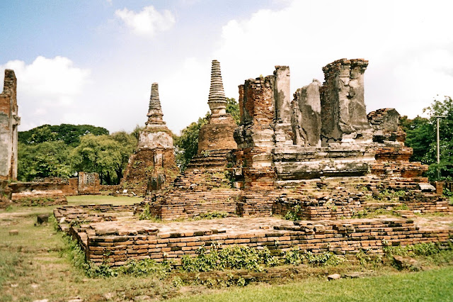 Within minutes we arrive at a dock where several canopied and colorfully-painted long-tailed boats are anchored. Their slender pointed bows arch upwards such that the tips, from which strings of garland and strips of colored hang (perhaps as a sign that blessings have been bestowed upon the boat and its pilot, or maybe a symbolic offering to appease or pay tribute to the ‘Satsana Phi’ spirit of the river?), sit high above the waterline and the rest of the boat. The dock is located along a narrow fork of the Chao Phraya River that parallels the main body of the river to the west and creates a slender island roughly in the shape of a dagger with the top of its handle in the upstream direction, and a light house positioned at its downstream tip. After boarding the long-tail boat, we are pushed back from the dock and slowly drift out into the narrow channel as the stern, coaxed by some paddle strokes along the port side, begins to gradually slew towards the downstream direction. Our pilot then sharply pulls the handle of the starter cable towards him and the long-tail outboard motor, whose long drive shaft is angled as such that the propeller is still above the waterline, sputters to life with a visible puff of white exhaust. The propeller, rotating lazily at as the motor idles, is then lowered into the water as the pilot slews the long-tail and gooses the throttle to point us towards the center of the channel, and we are at last on our way, getting another glimpse of the Bang Pa-In Royal Palace as we motor by. The channel provides us with passing views of stilted riverside houses that remind me of those seen along the khlongs (canals) which branch off from the Chao Phraya to extend into the various neighborhood of Bangkok and are used by the locals as avenues of waterborne transit, earning the city the moniker of ‘The Venice of the East’. We pass a short khlong that branches off to the right at a 90 degrees that is flanked by houses and spanned by a small road bridge, and after following a bend around the northern tip of the dagger-shaped island, we rejoin the main body of the river for the remainder of the cruise upstream to view the temple ruins of Ayutthaya. This part of the Chao Phraya River is fairly calm relative to the arc of the river extending from Wat Arun Temple north to the junction with Khlong Bangkok Noi, which I had transited during my first long-tail boat ride in Thailand some days earlier, where the chop resulting from the combination of the river current and the criss-crossing wakes of the numerous passing long-tail boats, water taxis and towed barges was nausea-inducing. Along the way, we pass other long-tail boats, a few larger motorized boat traveling abreast sharing the task of pulling three loaded barges daisy-chained together in a single-file line upstream in tow, and more semi-rural riverine scenery that becomes more city-like as we follow the river's course into the city of Phra Nakhon Si Ayutthaya, where we soon dock and rejoin our driver, guide and water-weary fellow traveler, who are awaiting for us near the jetty in our tour van with the air conditioner running as we walk up.